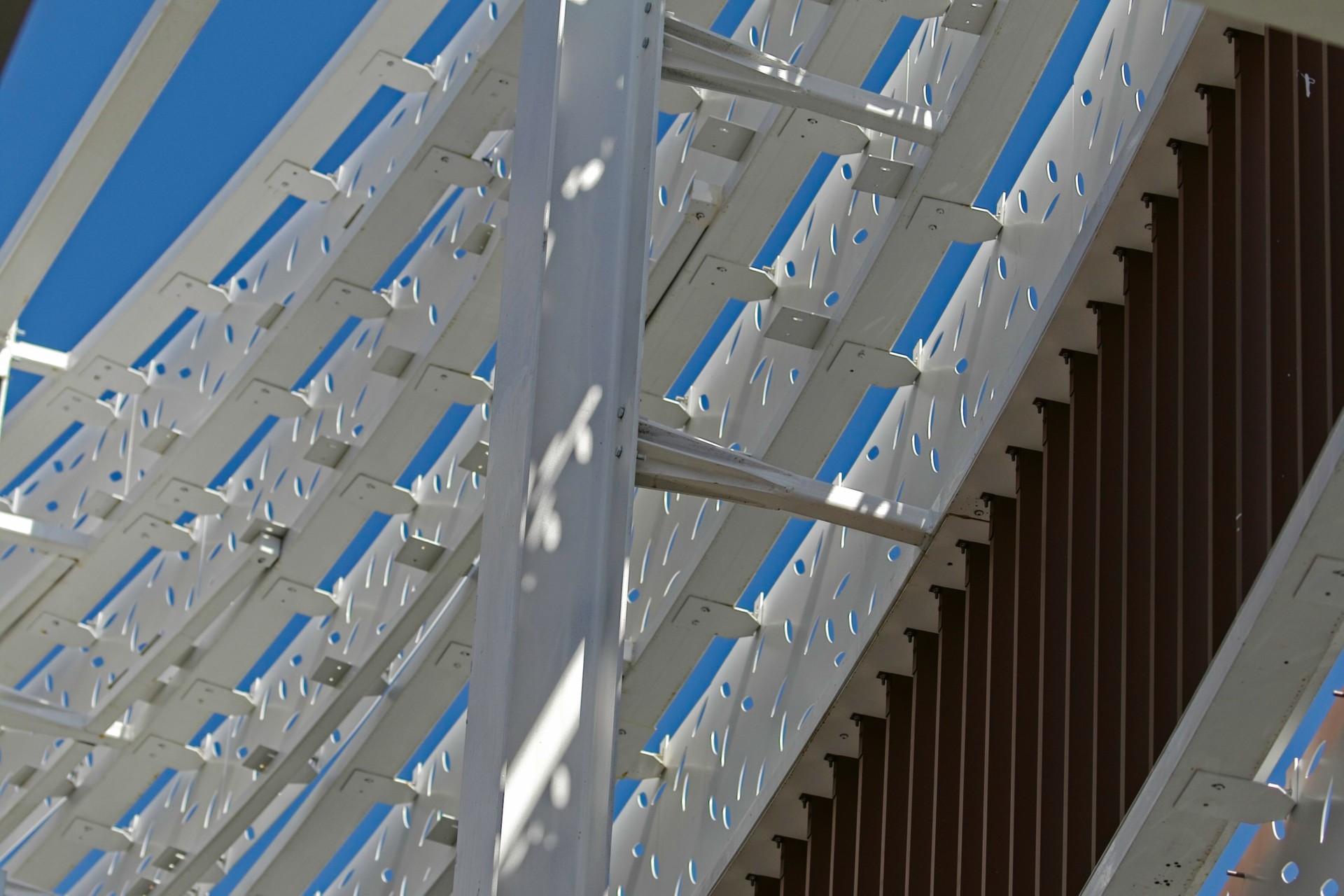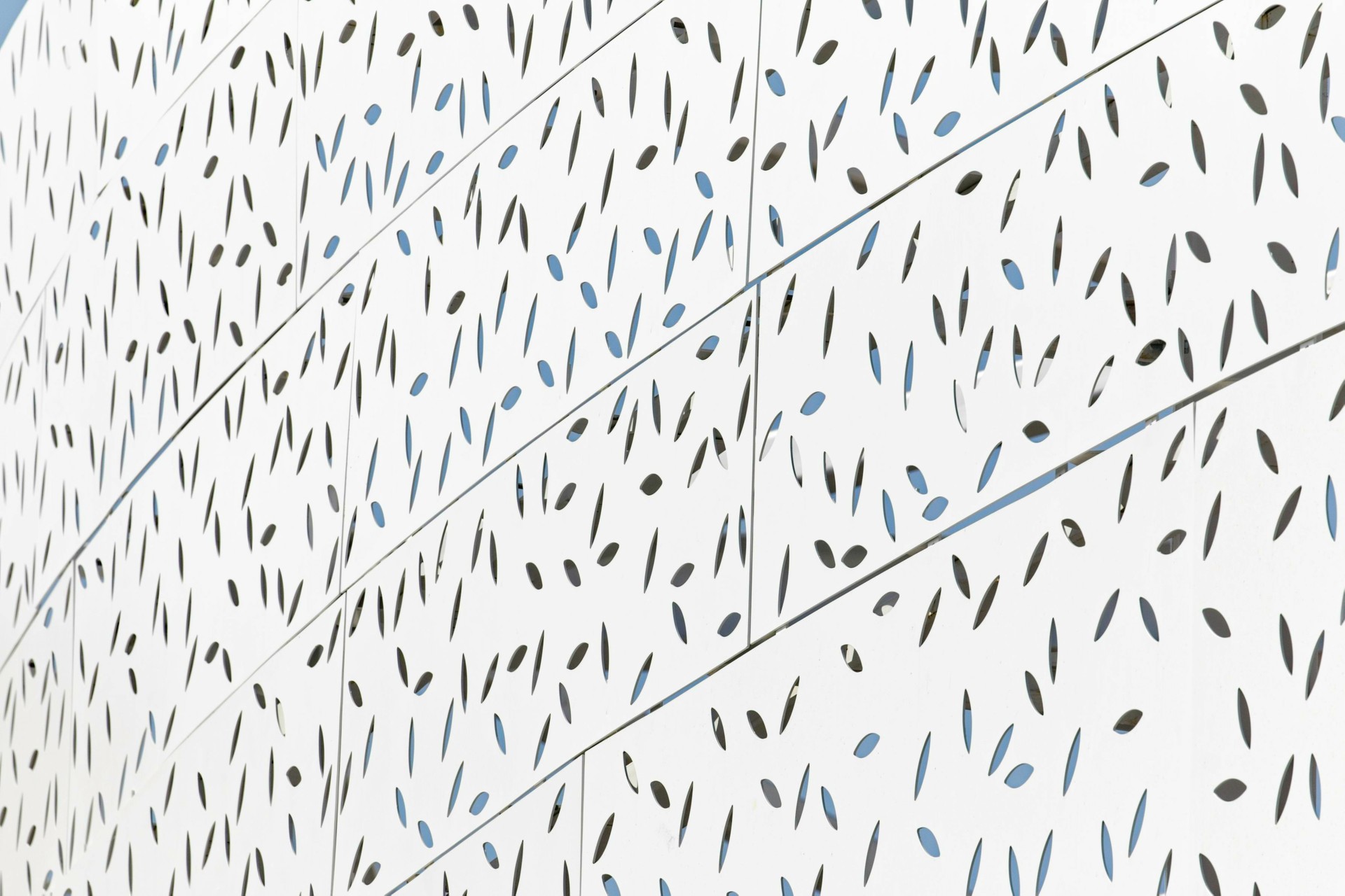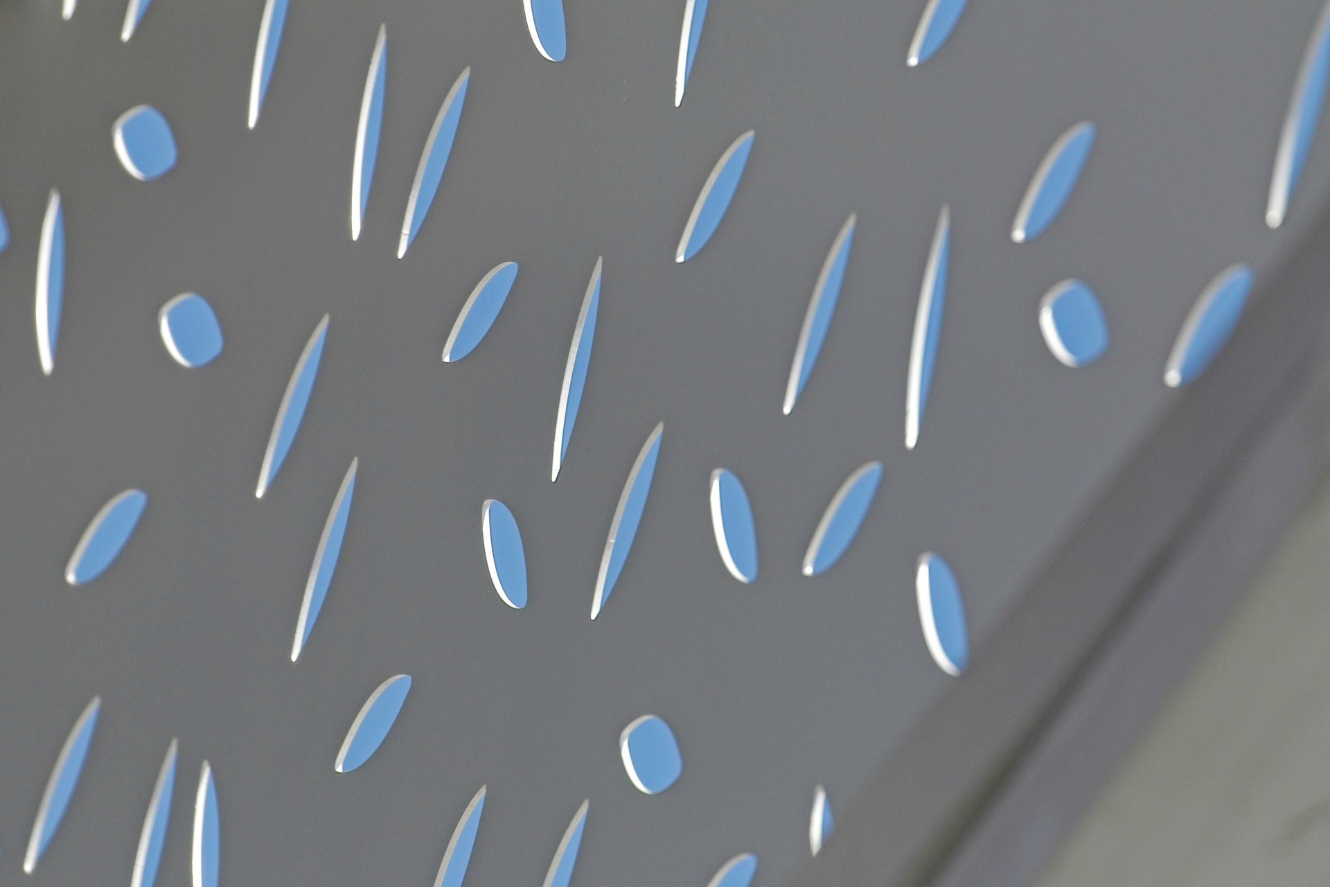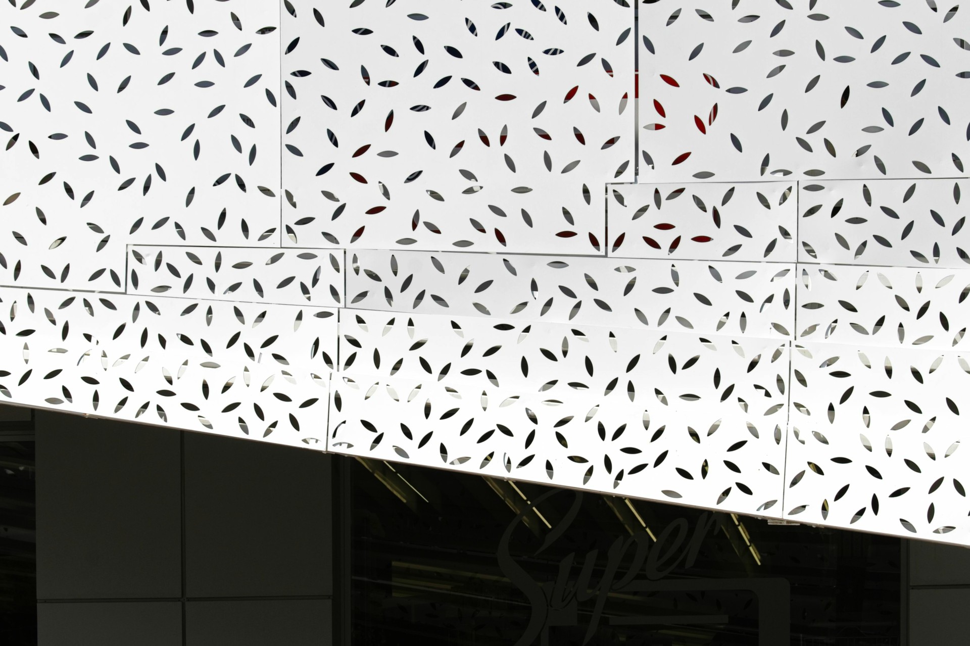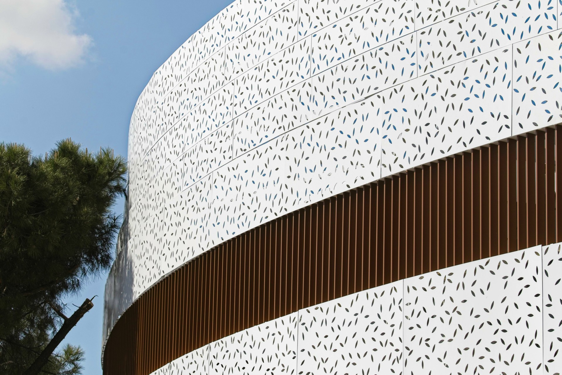 This elegant façade was crafted by Valavanis Metal with precision and care, showcasing the possibilities of modern metal processing. Made from laser-cut aluminum panels, finished with a durable powder coating, the design features a pattern of organic shapes that adds a sense of lightness and movement. The panels are carefully shaped to form a seamless curved surface, creating a visually striking and recognizable architectural element.